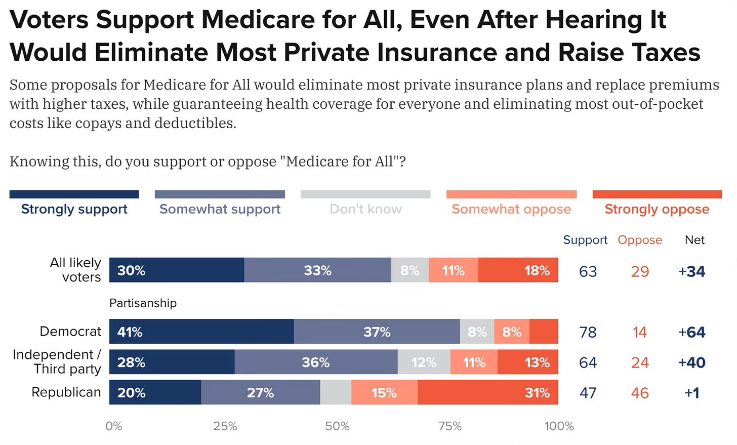 In the Data For Progress survey, 63 percent of Americans said they support Medicare for All even knowing that it “would eliminate most private insurance plans and replace premiums with higher taxes.” That support is across the political spectrum - 78 percent support from Democrats, 64 percent support from independents, and 47 percent (a plurality) of support from Republicans. In all, just 29 percent of voters were opposed.